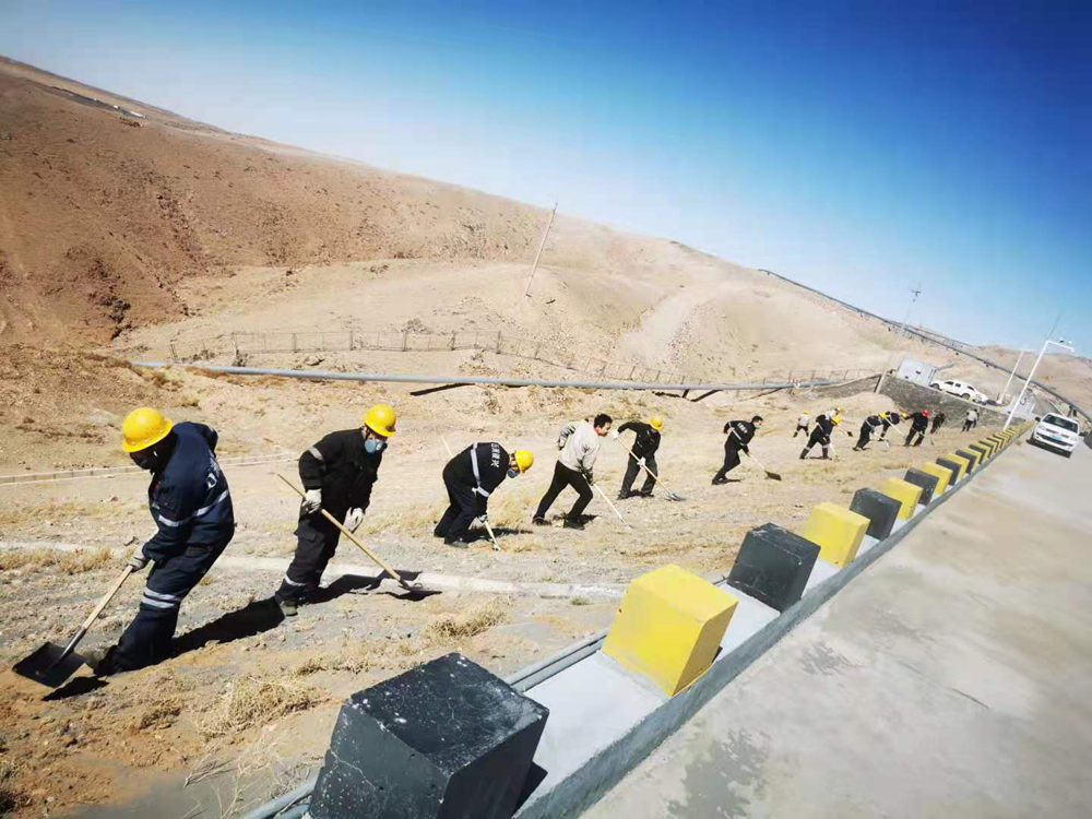 本次活動(dòng)重點(diǎn)對(duì)基礎(chǔ)壩兩側(cè)坡面進(jìn)行綜合治理,治理長度約1.5公里。面對(duì)坡陡、風(fēng)大、黃沙亂舞的工作環(huán)境,黨員干部不懼困難、以身作則、俯沖一線,帶頭撿拾垃圾、清理尾砂、覆土灑水以及對(duì)安全警示牌進(jìn)行維護(hù)保養(yǎng)。廣大職工緊跟其后,或一字排開,或矩陣展開,忙碌的身影遍布整個(gè)坡面,鏟車的轟鳴聲、鐵锨的吱吱聲與狂風(fēng)的呼嘯聲琴簫合奏,在藍(lán)天、斜陽和荒山的襯托下,勾勒出一幅“聲與色”、“動(dòng)與靜”相得益彰的勞動(dòng)生產(chǎn)畫卷。
